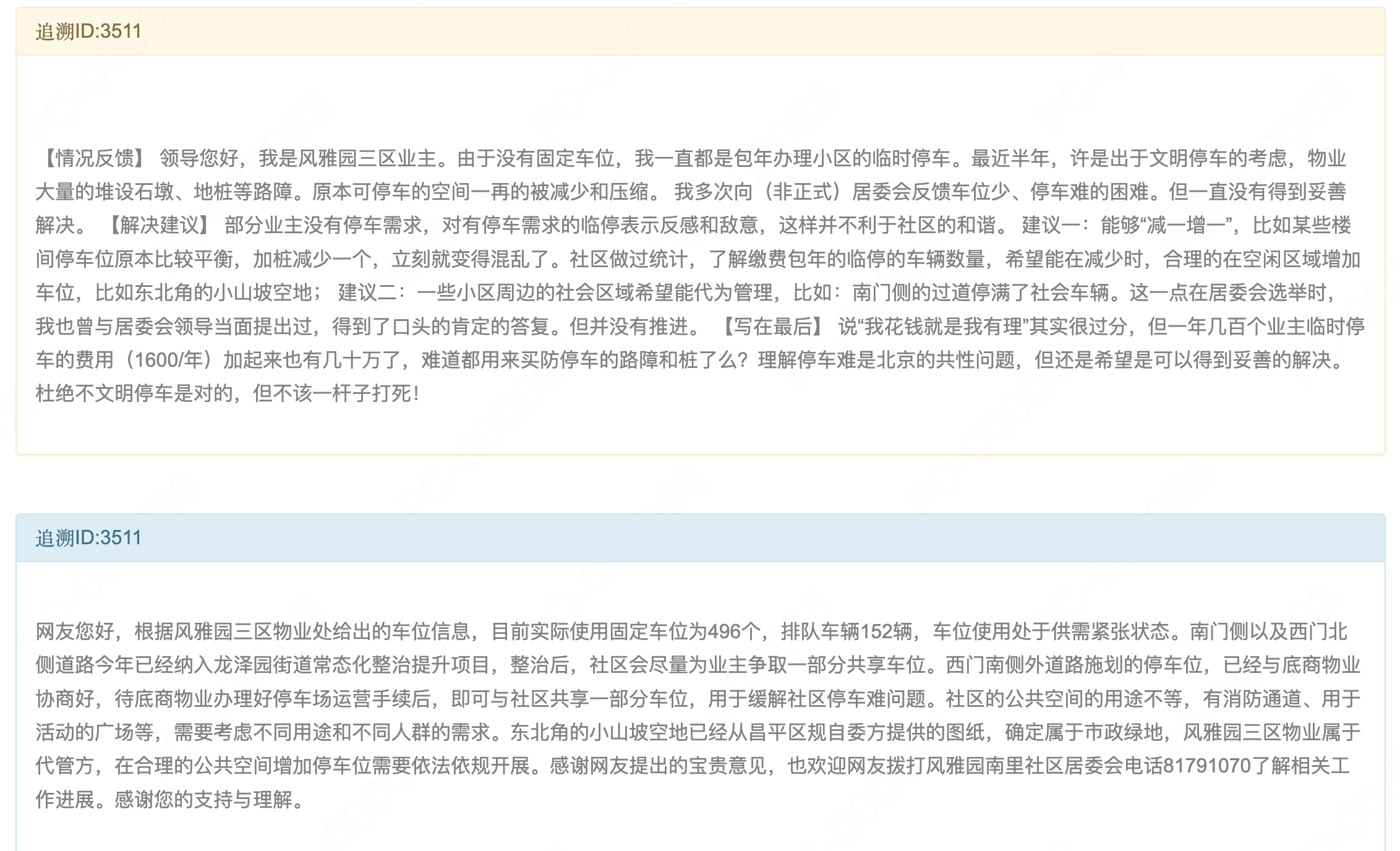 领导您好,我是风雅园三区业主,去年曾在平台反馈过一次小区停车难的问题。如今过去一年了,问题不但没有任何缓解,反而有加重的趋势。 1. “旧的不去新的来”,在小区没有新增车位的情况下,不断有业主新购车,无固定车位车辆越来越多,流动车位挤占严重。居委会选举时,所有“声称”关于增加停车位的举措阵仗颇大,期间也开过会、贴过告示,但最近几个月也没动静了,不排除“夭折”的可能。 2. “锅里不吃,吃别人盘里”,固定车位的车主嫌车位远,随便找个地儿停,他随便了,我没地儿停了。这个问题反馈过物业,他们明确表示“管不了”。 个人建议:新增车位不敢“奢望”了。但我说一个北京部分小区确实实施的办法:固定车位和流动停车区别收费,因为流动停车没处停得去外面找收费停车。至于固定车位涨点还是流动停车降点,那见仁见智了。 对物业说一句:如果确实因为问题难就不解决,那没什么问题需要你们解决了